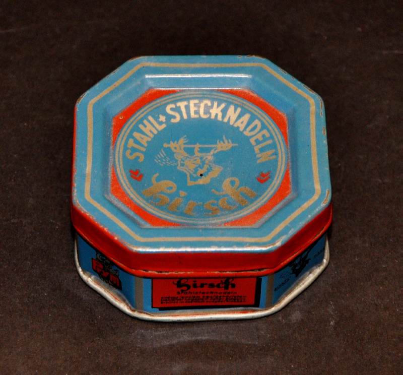 Gammel Knappenåle-æske Hirsch - Stahl Stecknadlen 6,2 cm. x 6,2 cm. - Højde 3 cm. Nb! Med brugsslitage Pris 45 kr. Varenr. H001 |