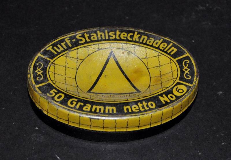Gammel Knappenåle-æske Turf - Stahlstecknadlen 7,5 cm. x 5,6 cm. - Højde 1,7 cm. Nb! Med masser af brugsslitage Pris 45 kr. Varenr. H002 |